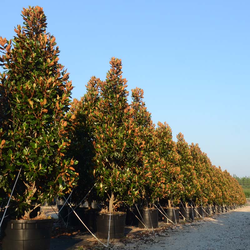 Little Gem is a compact Southern Magnolia with dense branching, glossy green foliage, and creamy white flowers that bloom throughout summer. Its smaller size and controlled form make it ideal for urban landscapes, tight spaces, or evergreen screens.
