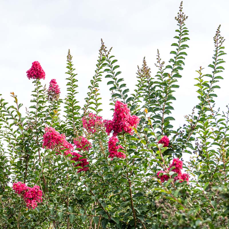 Tuscarora is a standout crape myrtle with coral-pink blooms and an upright, vase-shaped form. Blooming in midsummer and often into early fall, it brings warm color, smooth bark, and strong vertical structure to the landscape.